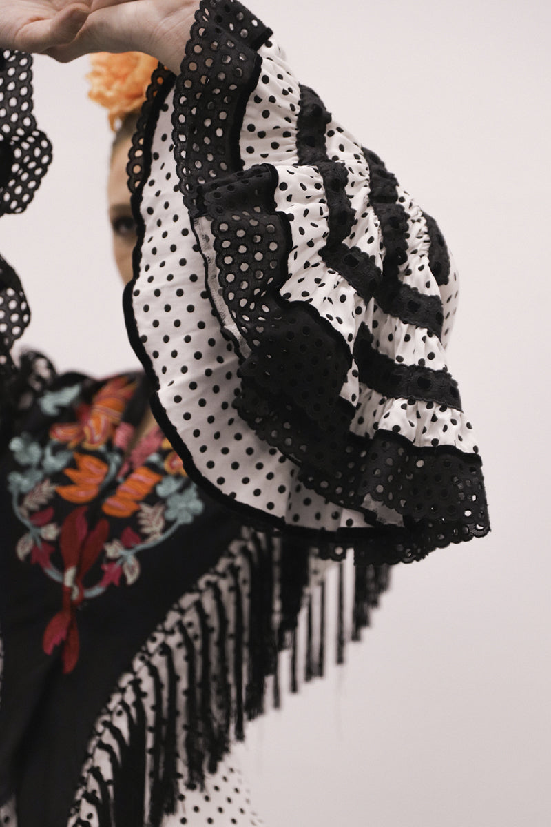 Modelo: traje canastero con pasacinta y tira bordada negra