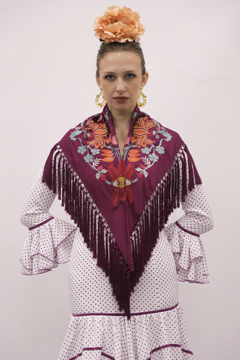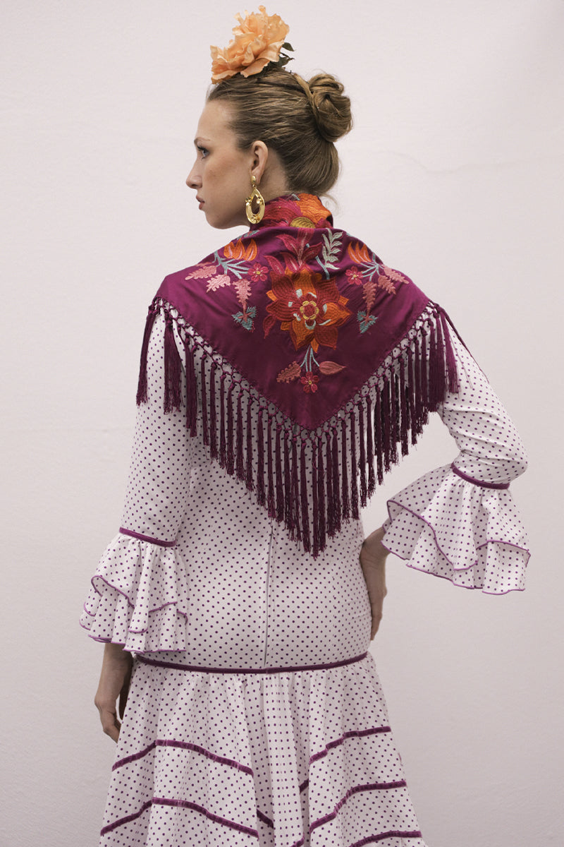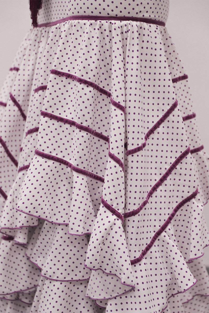 Modelo: traje blanco lunar pequeño morado, primer volante en pico con terciopelo y resto volante redondos