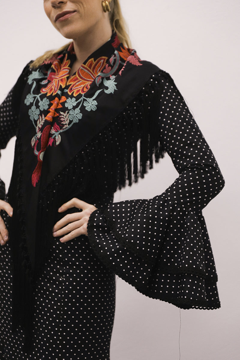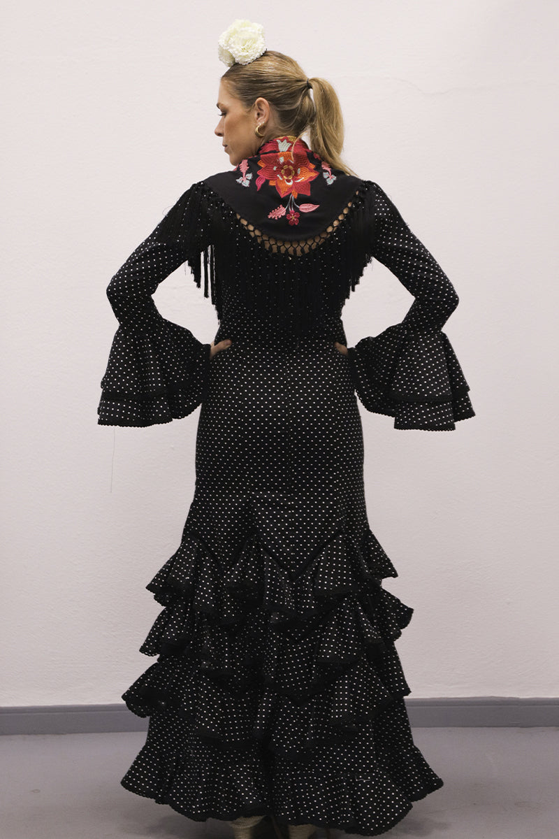 Modelo: traje enterizo 3 volantes en pico y uno redondo, terciopelo negro y puntillita negra en volante