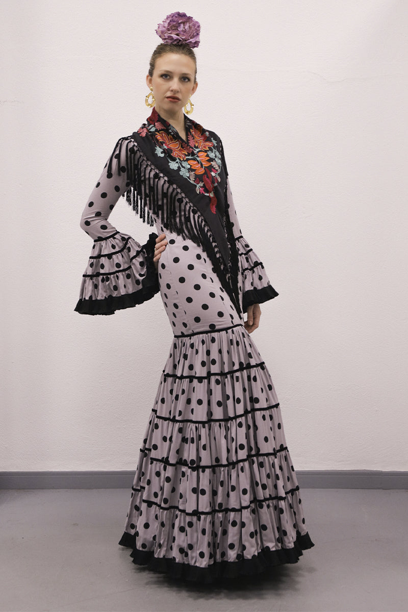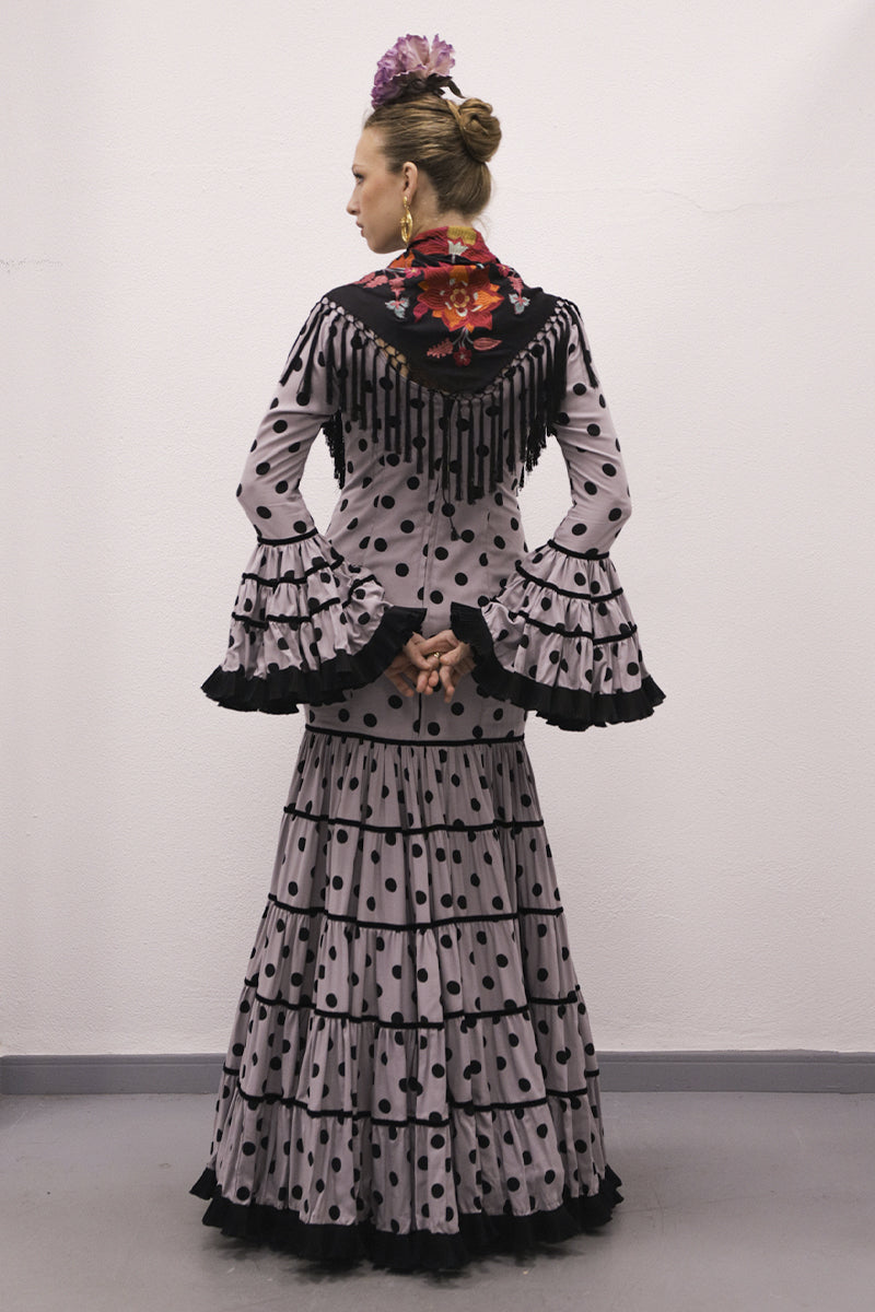 Modelo: traje canastero gris lunar negro, terciopelo y plisado