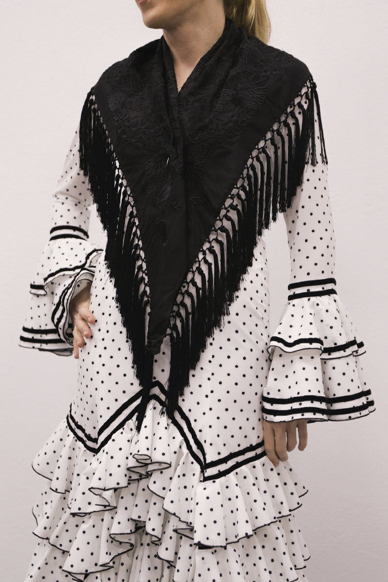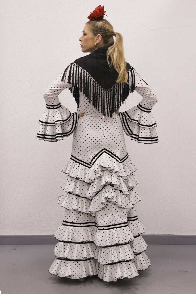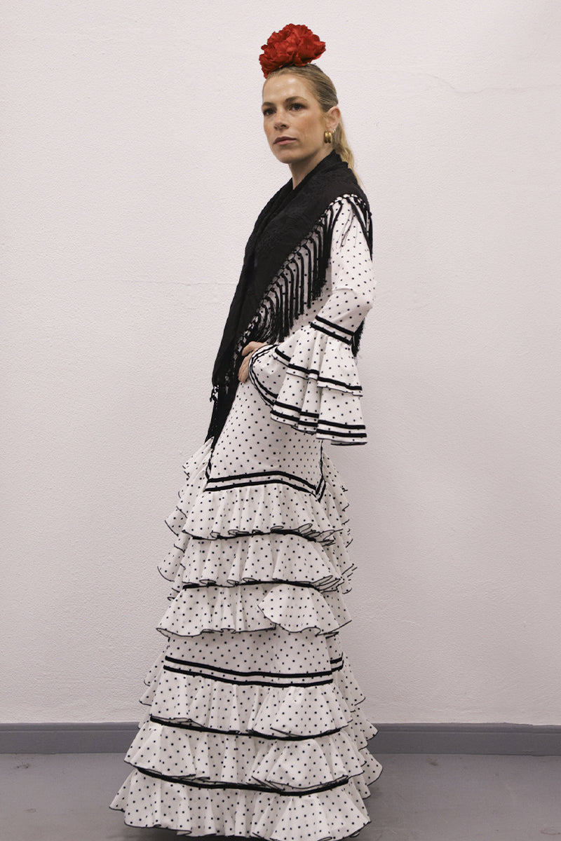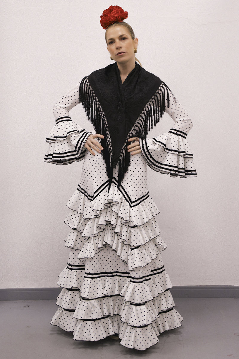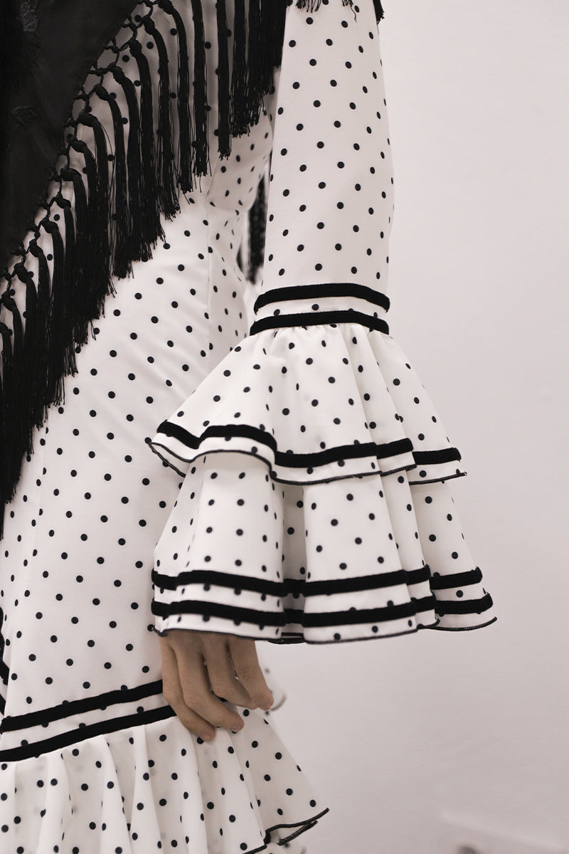 Modelo: traje cortado con 3 volantes en picos y 3 redondo con terciopelo negro