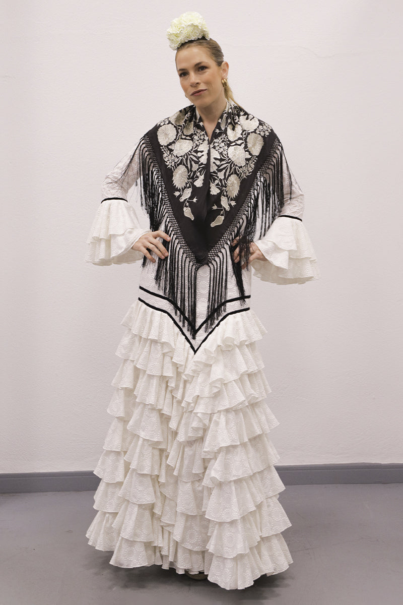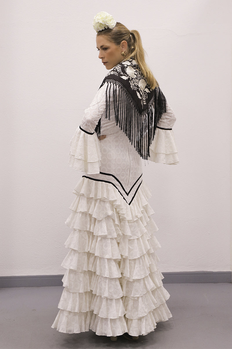 Modelo: traje con talle alto y tejido algodón bordado con 8 volantes y terciopelo negro