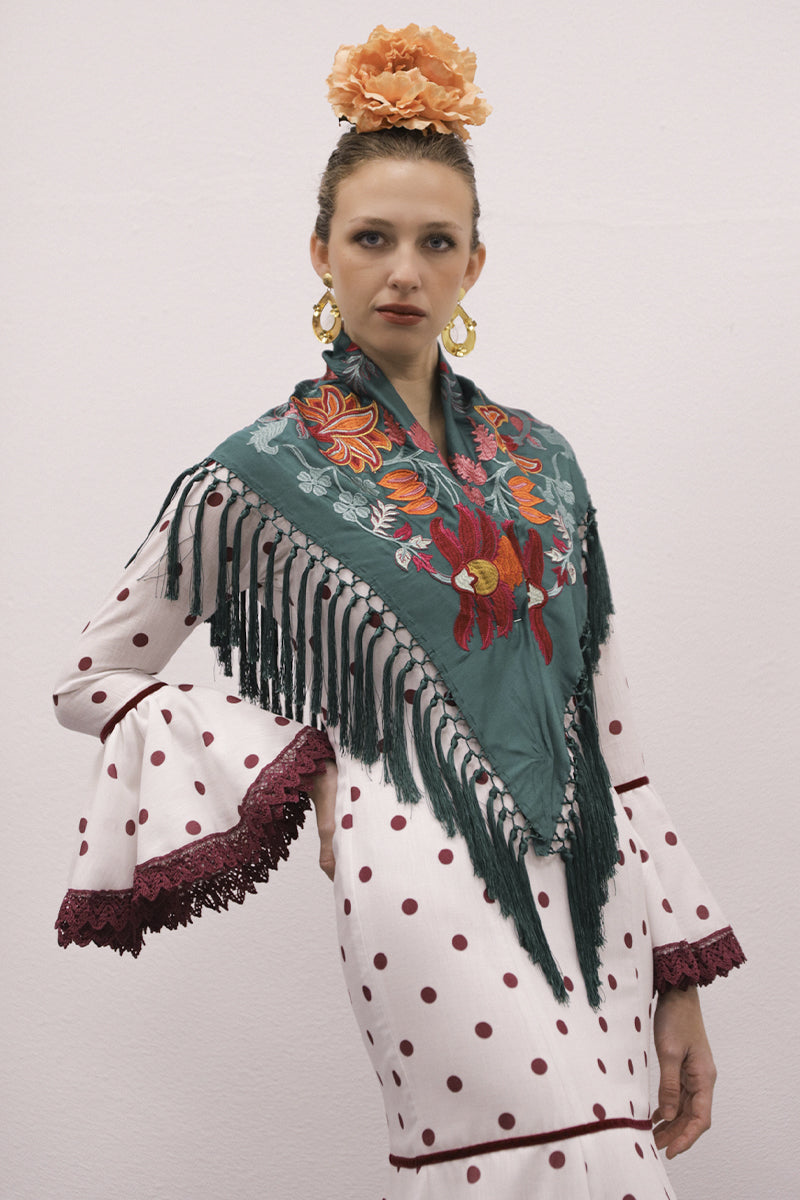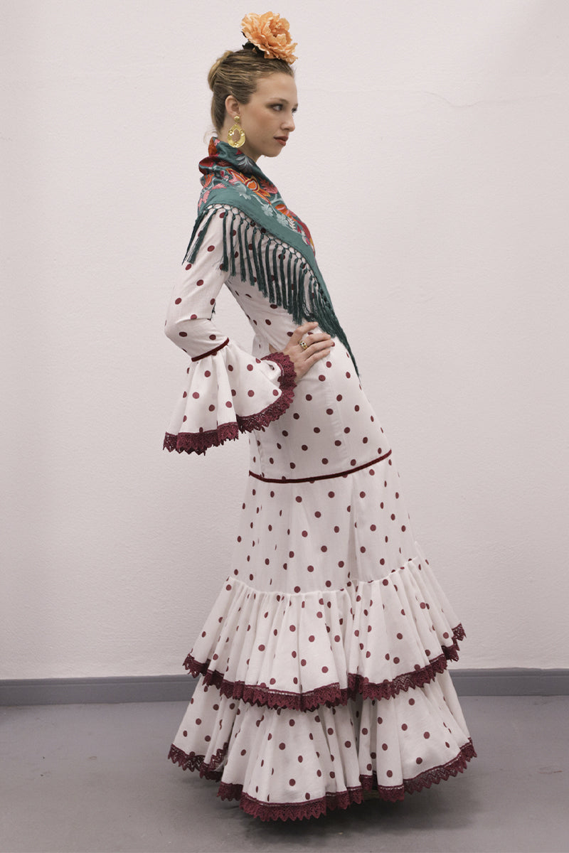 Modelo: traje enterizo blanco con lunar burdeos y dos volantes