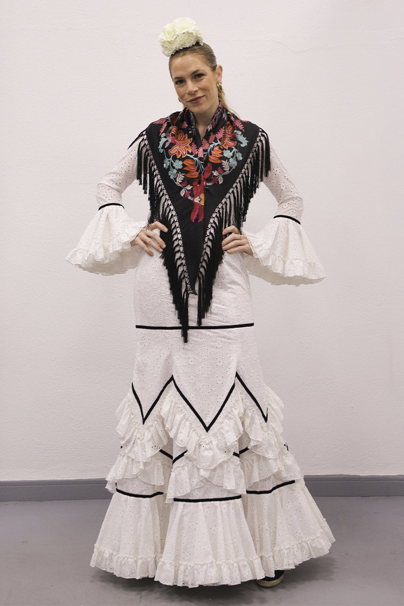 Modelo: traje perforado con volantes en pico y terciopelo negro