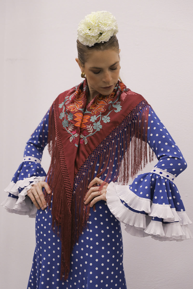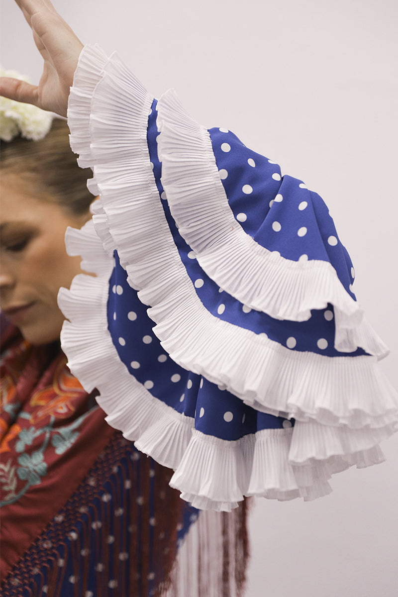 Modelo: traje enterizo azulón con lunar blanco y volantes en pico con plisado