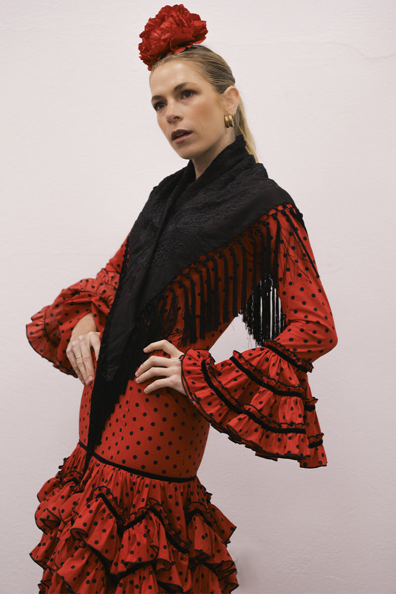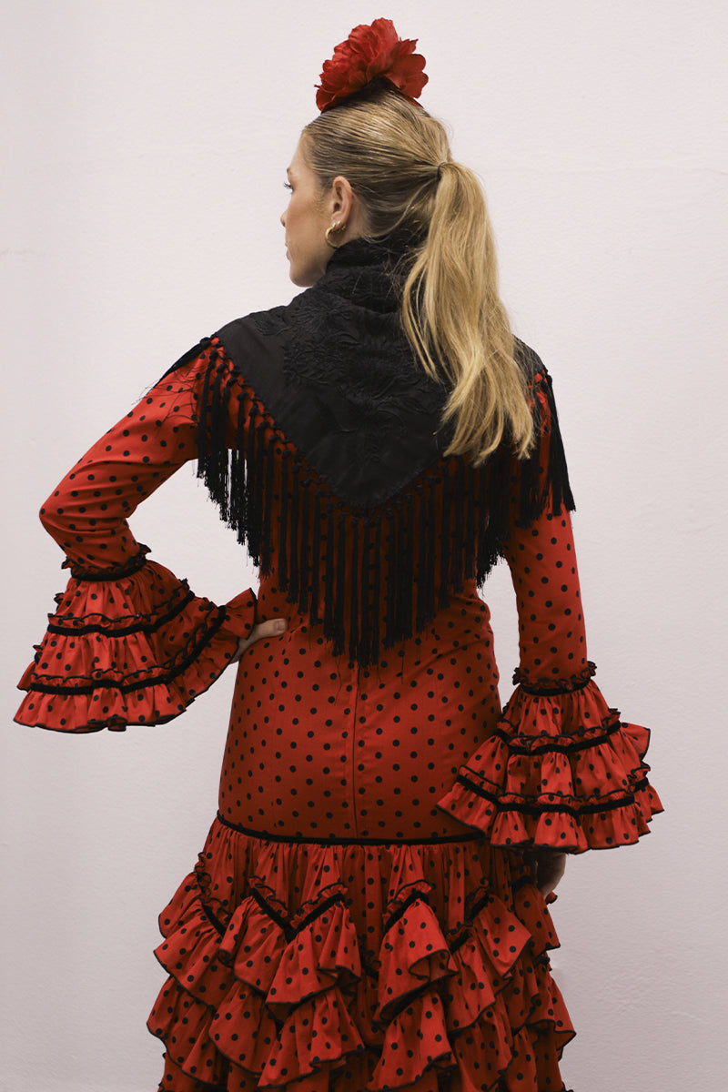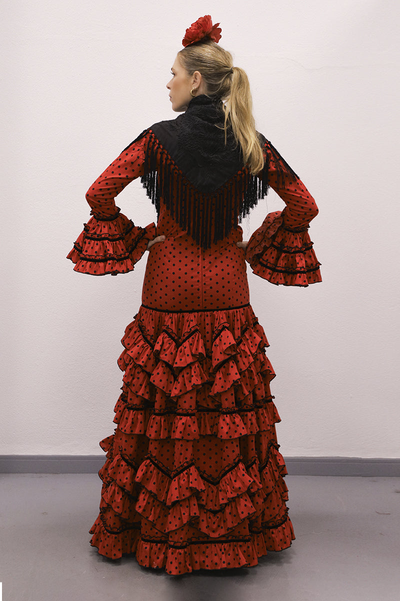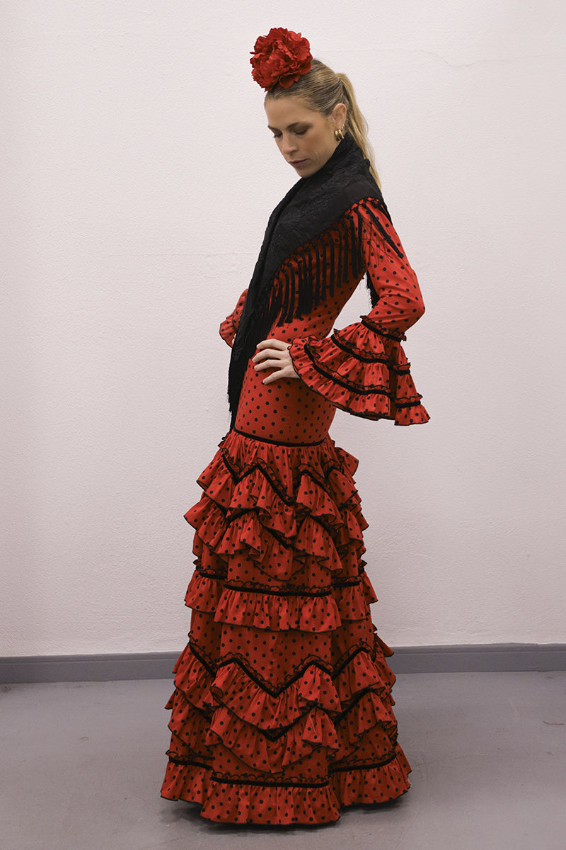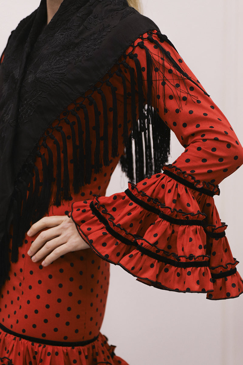 Modelo: traje con talle alto, volantes en pico y volantes redondo con terciopelo negro